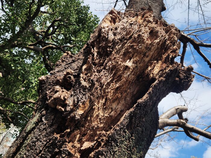 折れたのか、伐られたのか。剥き出しのままの傷口に古い叫び。