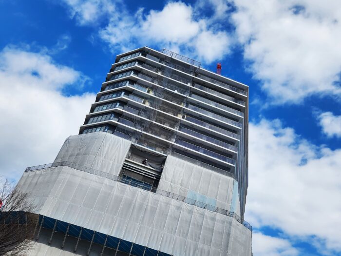 この町のどこからでも見えるクレーンが組み上げているビル。やっぱり竣工はまだ先みたい。