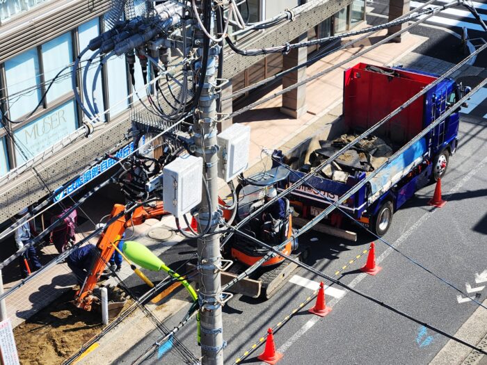 何度も掘り返されるベランダ直下の道路。工事の人たちに罪はないけれど、どうしたもんだか。