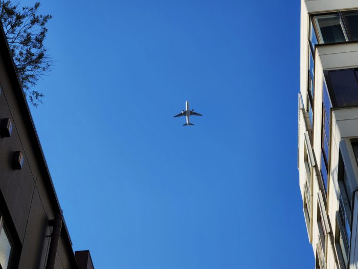 神宮前上空に旅客機。このルートで羽田に降りた経験はまだないな。