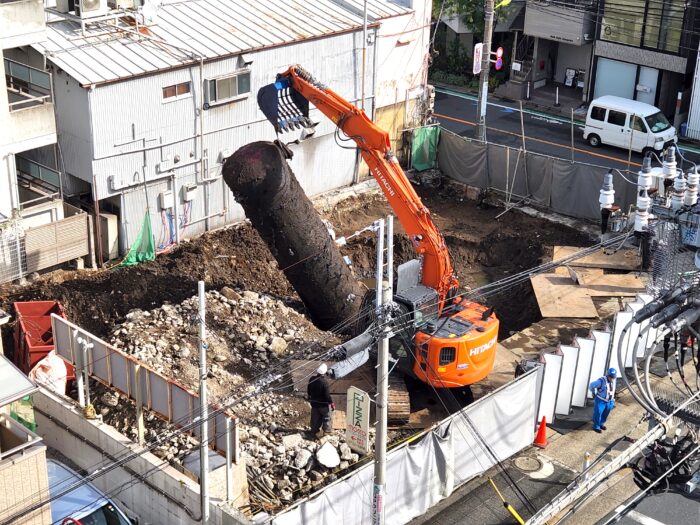 ガソリンスタンド解体作業に進展。2本目のタンクを地中から回収。まだ1本あるみたい。