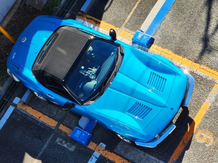 真下の駐車場にとまっていた、青のキレイなクルマ。何て名前?