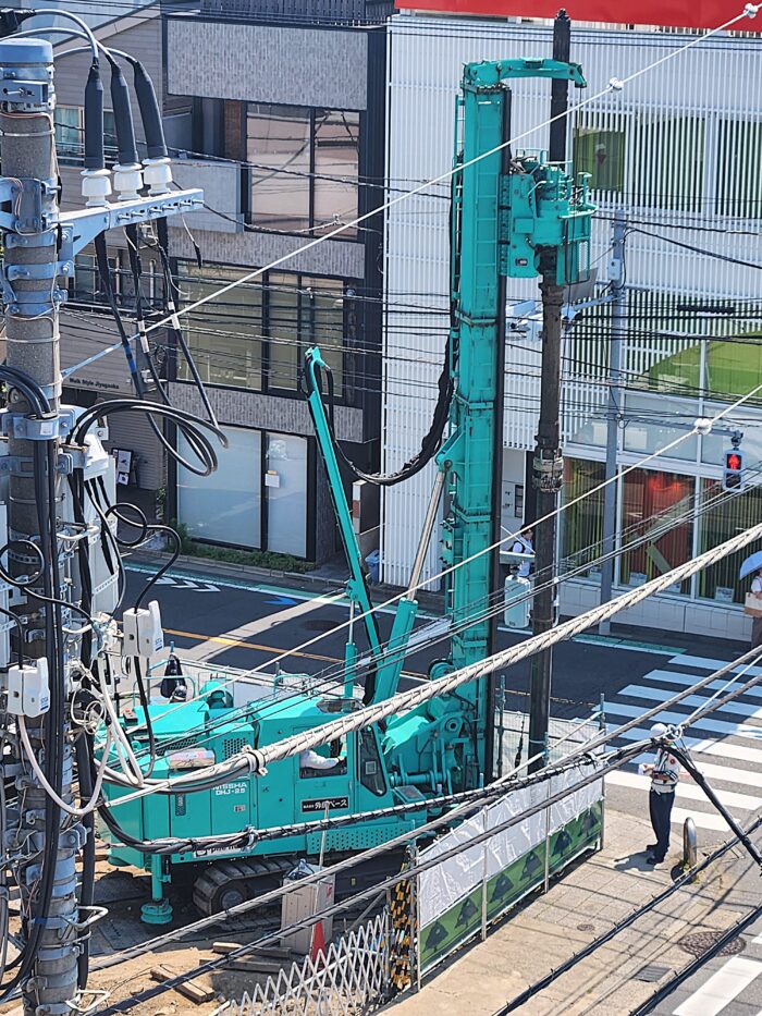 こちら杭打ち作業。打ち込むというよりねじ込むようで、けっこう静かでした。