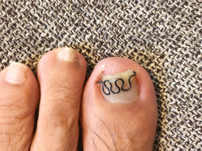 初回治療は、巻き込む爪を開くための矯正器具の装着がメイン。食い込んで傷ついている個所に器具を差し込むときは、奥歯を思い切り噛みしめて耐えなければなりませんでした。