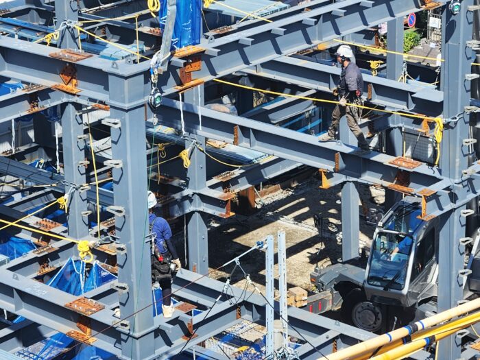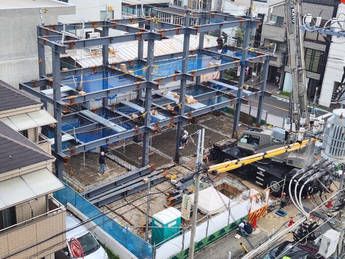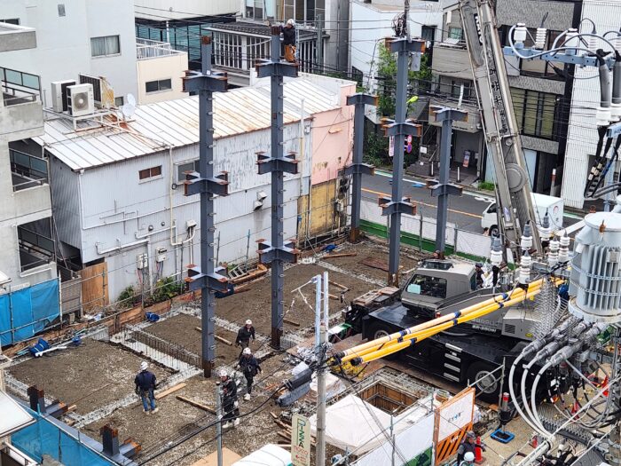 2枚目の写真で確認できると思いますが、すべての鉄骨はクレーンで釣り上げています。釣り上げるためクレーンから伸びたフックは、人が鉄骨の根元からよじ登って外していました。とび職の方でしょうか。すべての作業が迅速かつ。高所が苦手な僕は、こんなときに地震など来ないでくれと願っておりました。