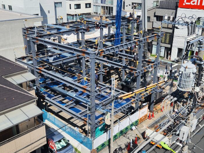 鉄骨を刺し始めた22日中には、敷地の半分で下の状況まで組み上がりました。その速さに驚嘆。骨組みだけとは言え、何かが建つ実感が明らかになり、町行く人たちも見上げておりました。