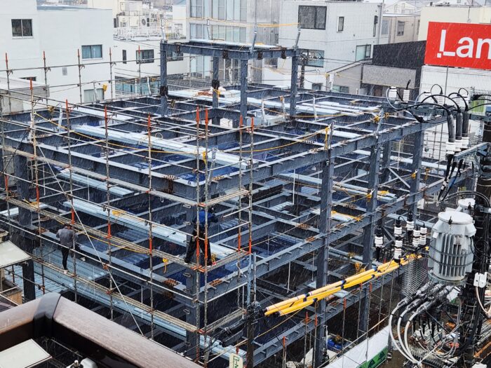 眼下の新築工事現場は四隅まで鉄骨が入りました。