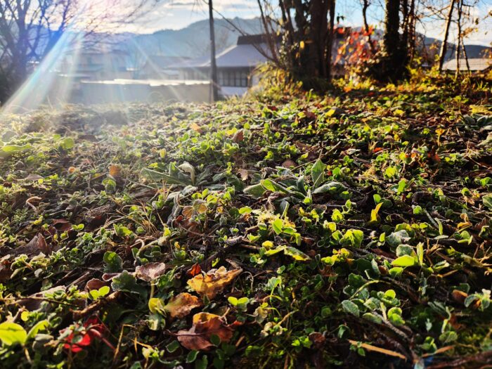 たぶん氷点下の、白馬の午前7時半。霜に凍えた草たちが息を吹き返していくところ。