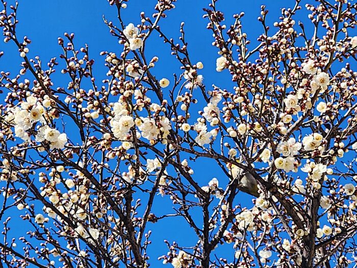 見えにくいけれど、梅に鶯ならぬメジロ。こういう写真が増えていきそうだな。