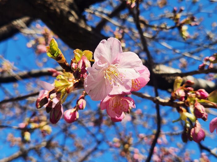 開花! これは早咲きの河津桜らしい。