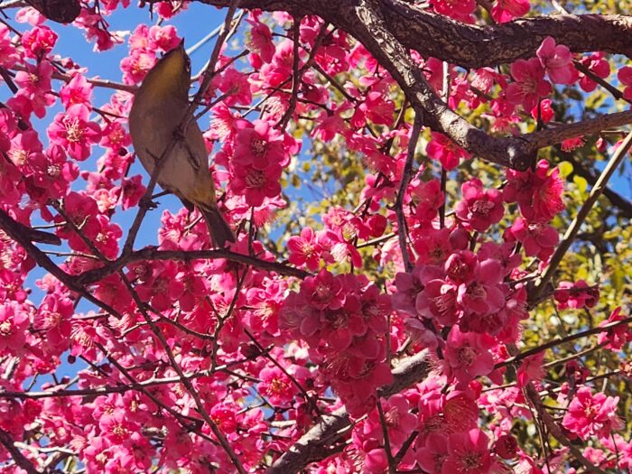 もしや? と思って梅の花を見上げると、かなりの確率でメジロがいてくれます。