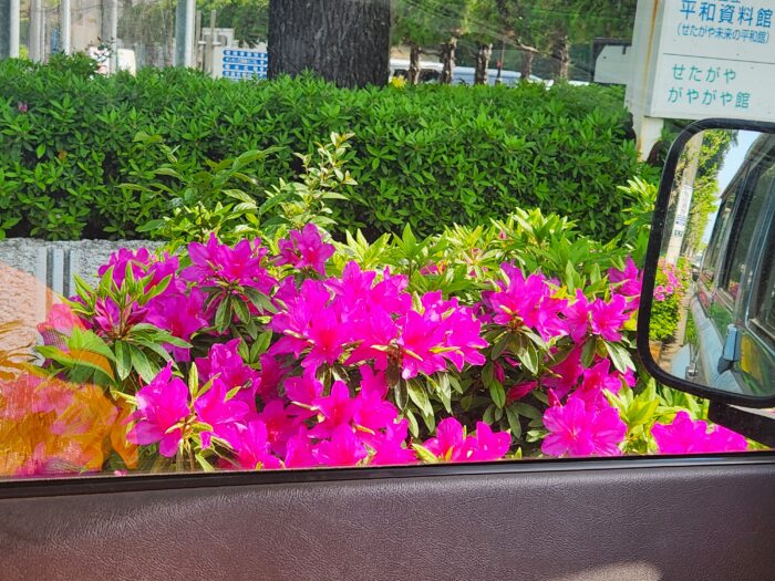 車窓にツツジ。躑躅なんて、書けないね。