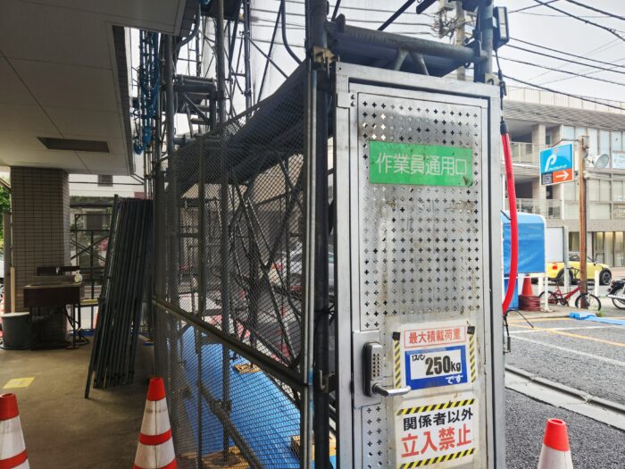 大規模改修工事で組まれた足場。誰でも登れると思ったら、ちゃんと鍵がかかるのね。