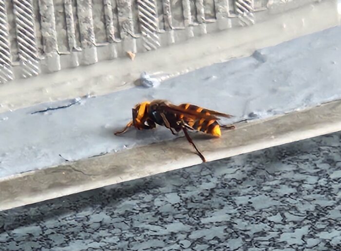 珍しく玄関前にスズメバチ。自ら危険を誇示する色目は、やっぱりアナーキーだよな。
