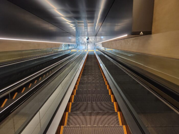他に誰もいないエスカレーター。どこに連れていかれるのか、ちょっと不安になる。